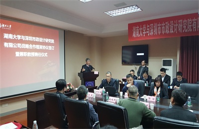 2016年11月29日下午,我司與湖南大學舉行戰略合作協議簽訂暨兼職教授受聘儀式。我司陳宜言董事長,監事會宋榮亮主席,黨委副書記、紀委書記郭明,副總經理許華林及相關部門負責人;湖南大學校長段獻忠,中國工程院院士陳政清,湖南大學科學技術研究院科技合作辦公室主任粟石軍,土木工程學院書記趙明華,院長陳仁朋等校院領導、教授、老師學生代表出席儀式。儀式由陳仁朋院長主持。