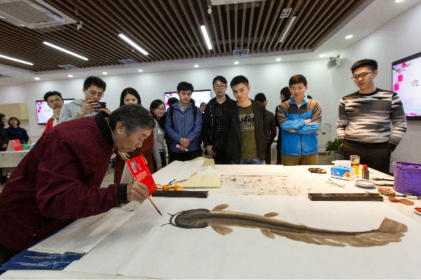 深漂藝術(shù)家魏治平老師在創(chuàng)作的間隙,為大家講述了書畫的精神內(nèi)涵以及在新時(shí)代下他對(duì)書畫的理解,生動(dòng)地將“青春踐行十九大”、“幸福都是奮斗出來的”、“逢山開路遇水架橋”等文字融入自己的書畫創(chuàng)作中,令在場(chǎng)的青年員工受益匪淺。