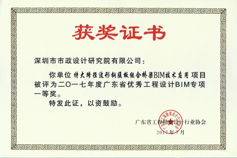 近日,我公司“特大跨徑波形鋼腹板組合橋梁BIM技術應用”項目被評為2017年度廣東省優秀工程設計BIM專項一等獎。